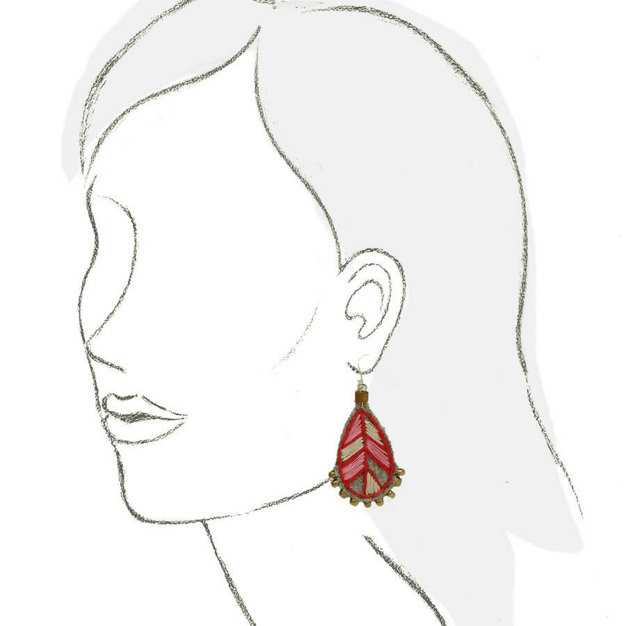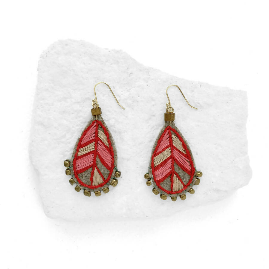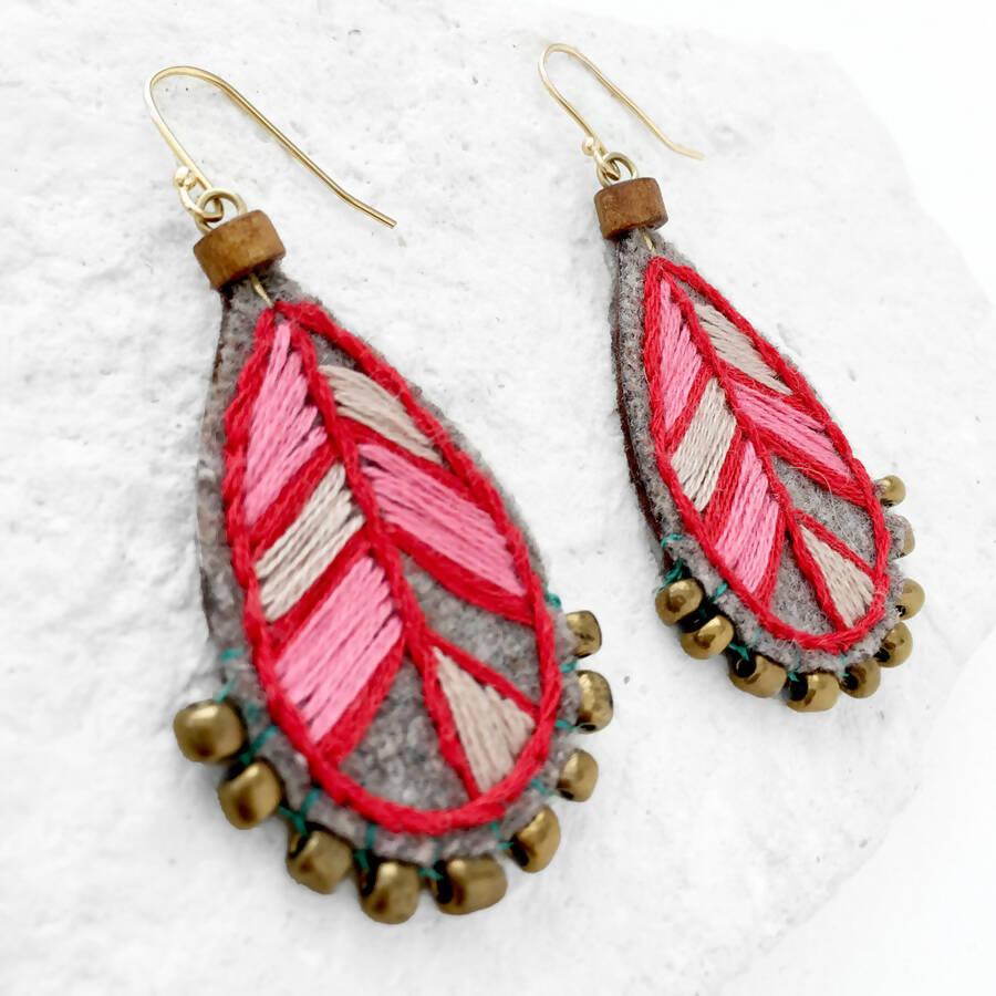 Drop-shaped earrings, hand embroidered with pink, beige and red cotton thread on gray wool fabric, with old gold colored glass beads and wooden beads. Gold sheet hook.