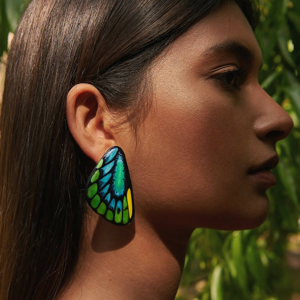 These fascinating large wing earrings inspired wing earrings inspired in Green "Birdwing" butterflies from New Guinea, are meticulously hand-painted by us, one by one, using layers of epoxy resin and sterling silver posts. Crafting each piece involves nearly nine different steps in the process, resulting in a stunning final product.Vibrant, shiny, and lightweight, these earrings are not only visually appealing but also comfortable to wear throughout the day. An ideal option for women who like bold earrings.