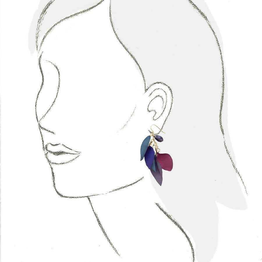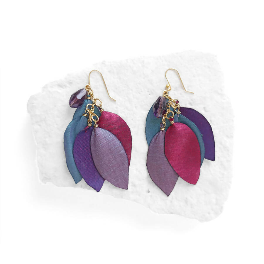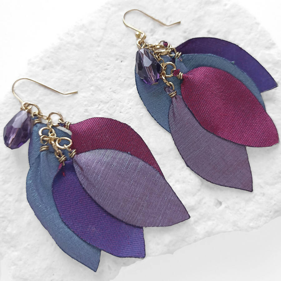 Earrings with fabric leaves in shades of purple, fuchsia pink and iridescent blue. With purple glass pendant drop and gold plated hook.