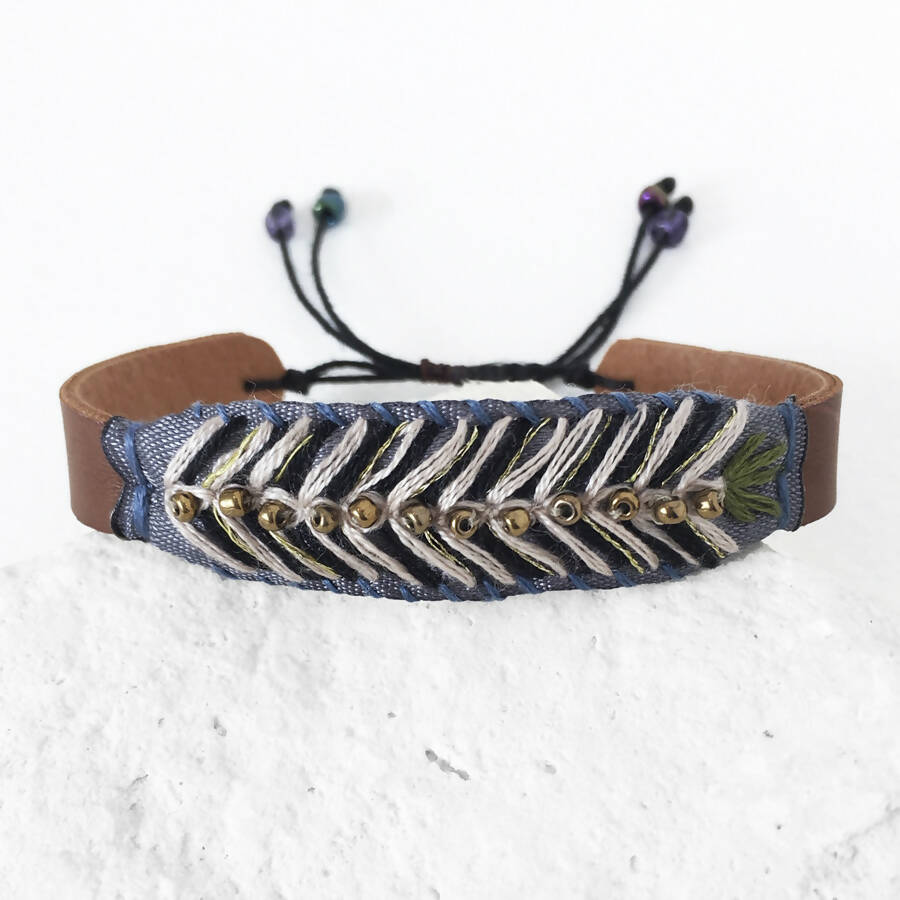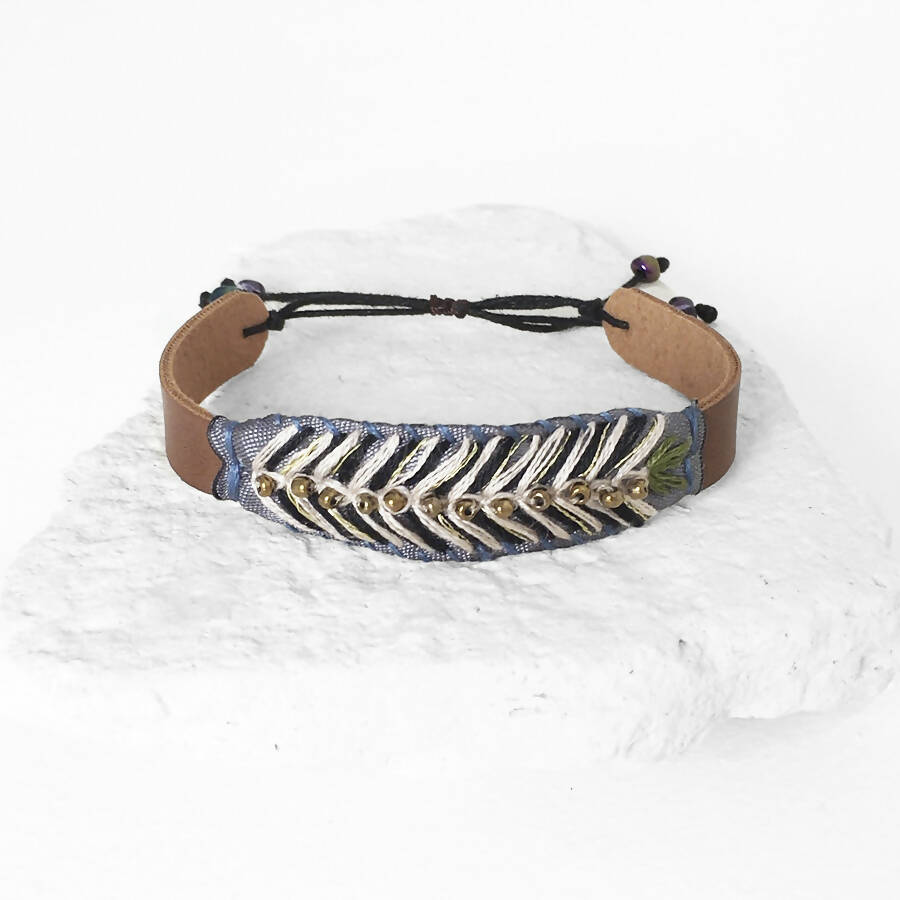 Hand-embroidered bracelet with cotton thread in black, beige and golden metallic thread, on gray ribbon and brown vinyl. Adjustable black cord clasp.