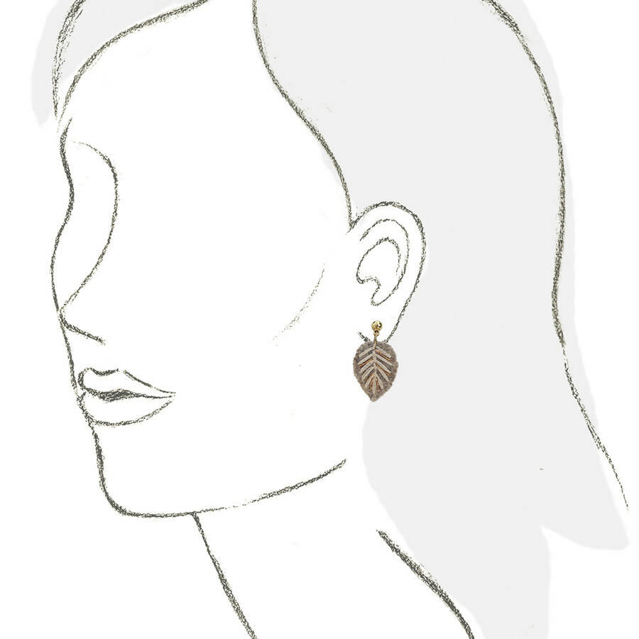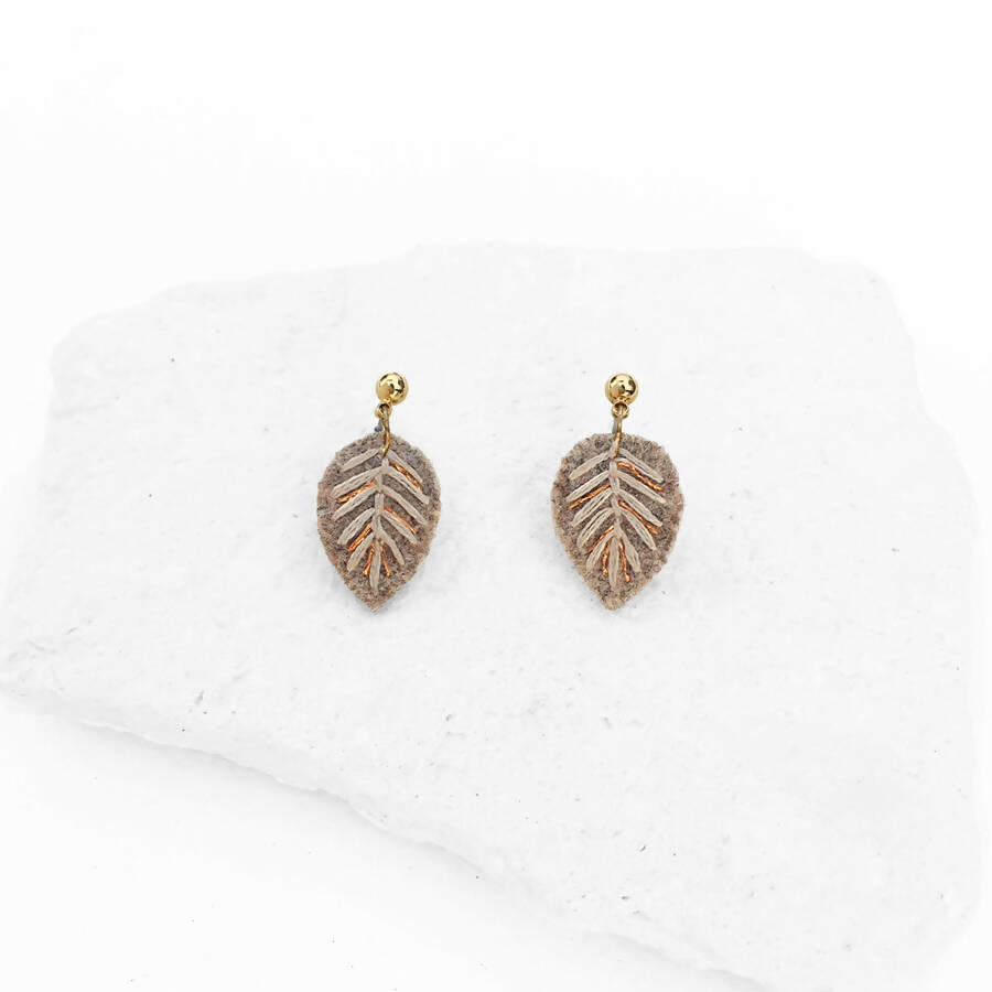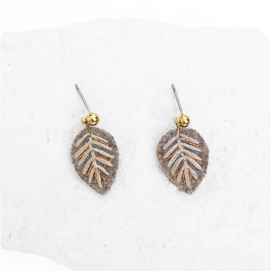 Leaf-shaped earrings, embroidered with beige cotton thread and copper metallic thread on gray natural wool fabric. Gold sheet buckler.