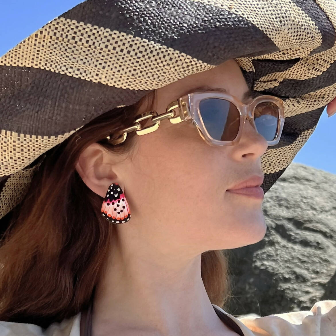 These exquisite wing earrings inspired in Pink Acraea, from Africa, are meticulously hand-painted by us, one by one, using layers of epoxy resin and sterling silver posts. Crafting each piece involves nearly nine different steps in the process, resulting in a stunning final product.Vibrant, shiny, and lightweight, these earrings are not only visually appealing but also comfortable to wear throughout the day. An ideal option for gifting to butterfly lovers.
