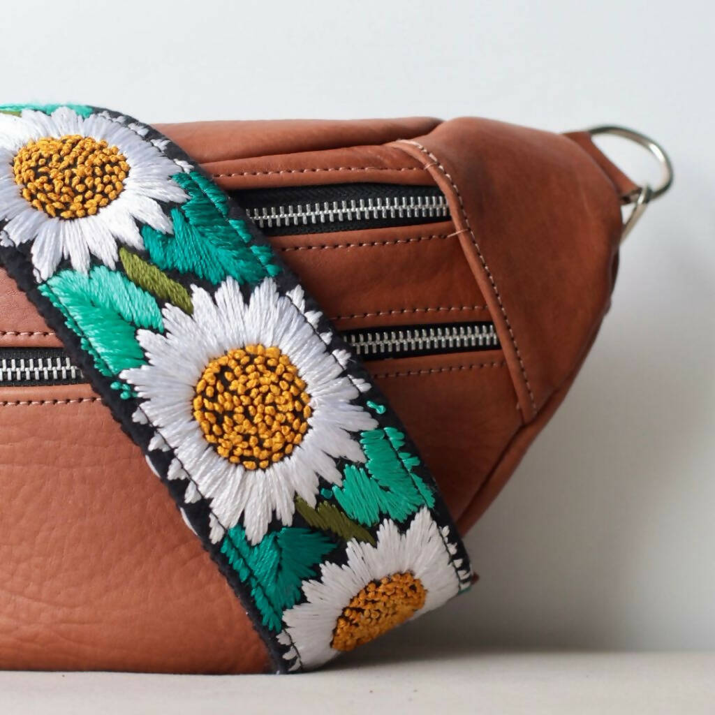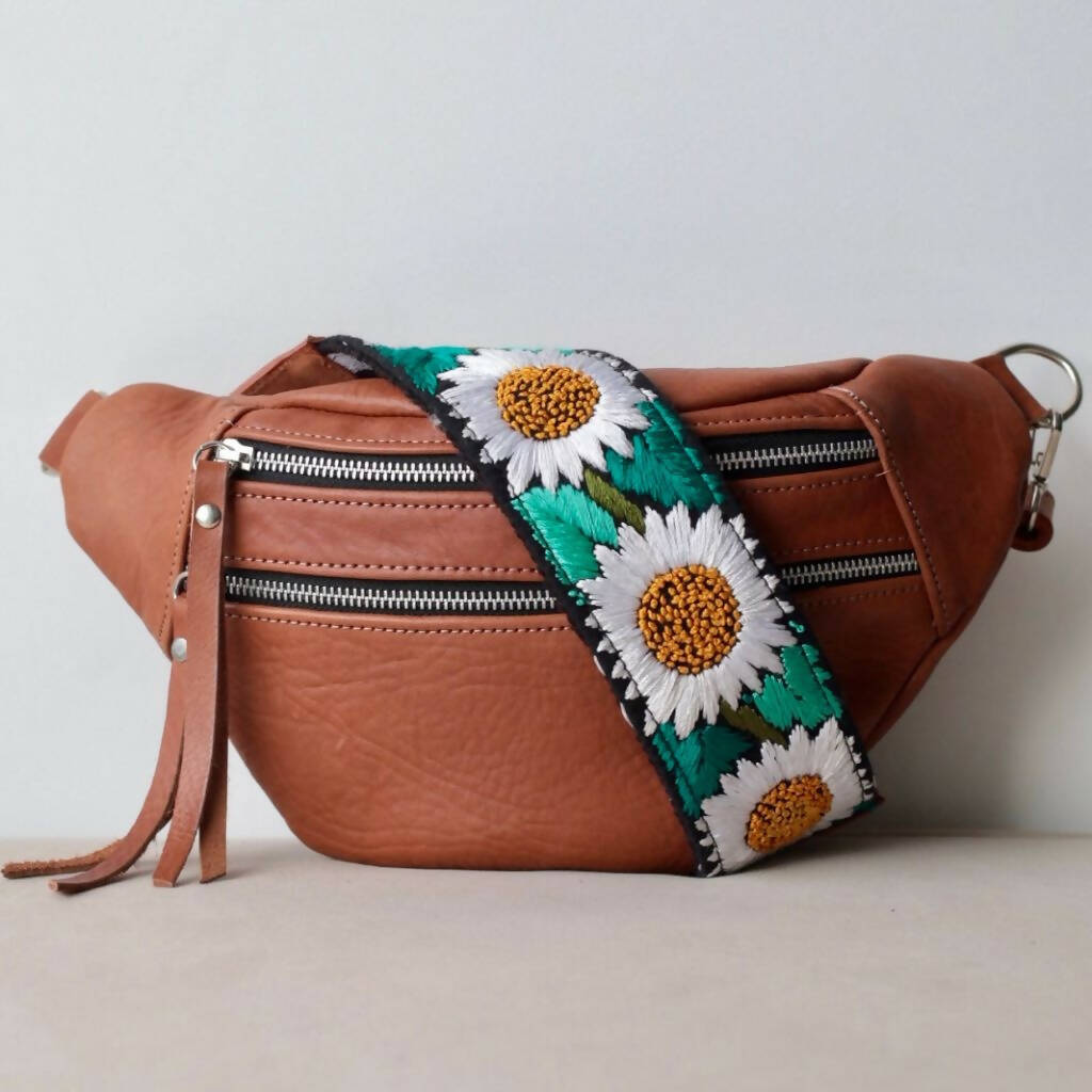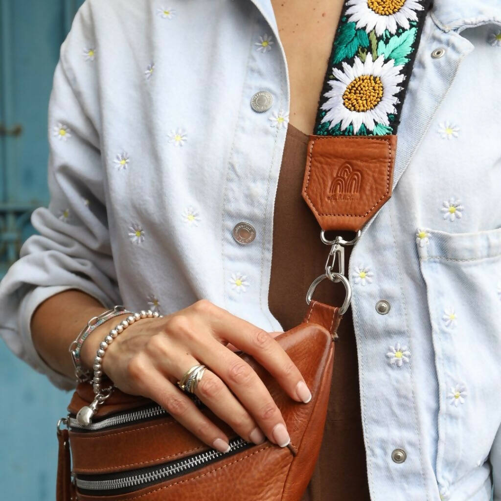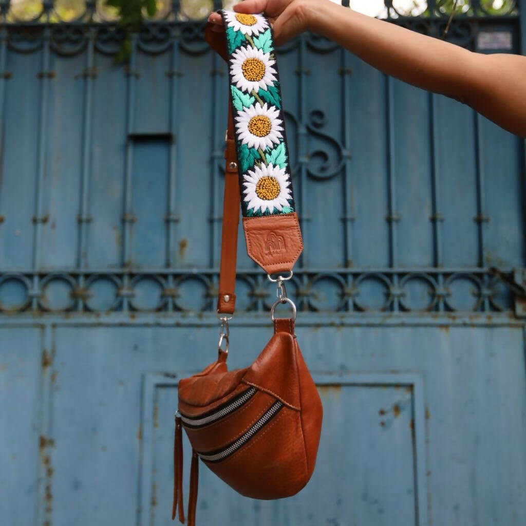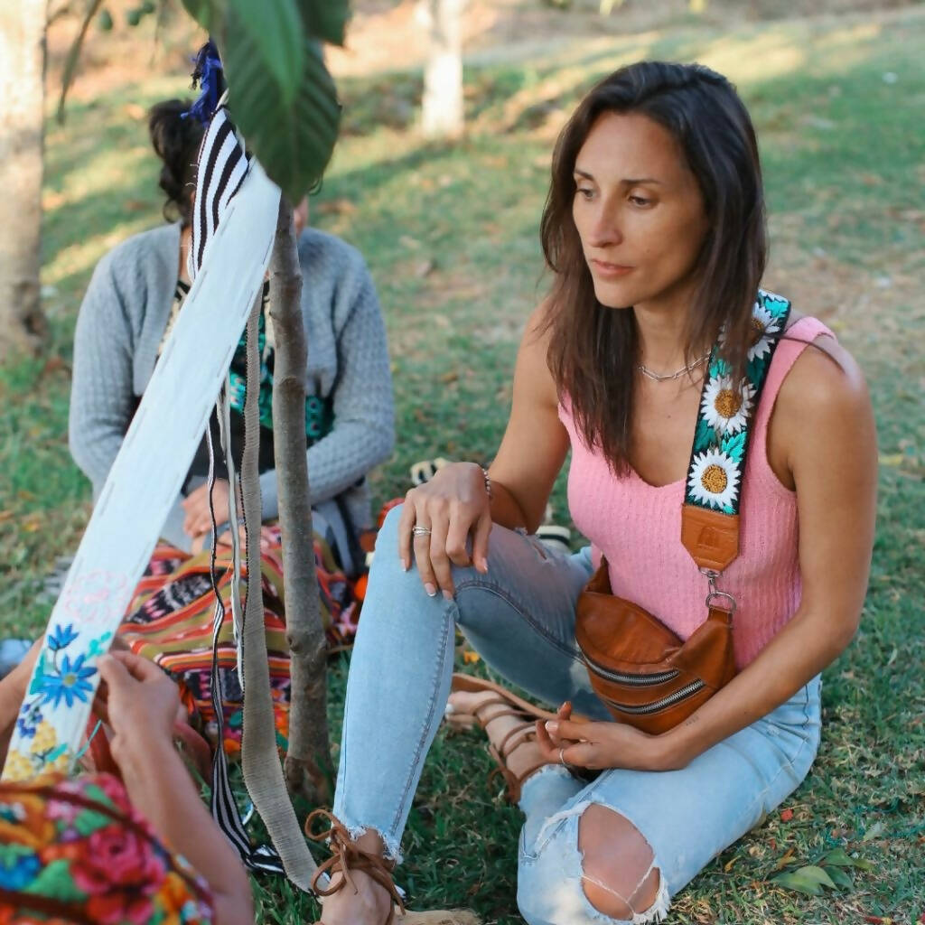 Our Emma Sling Bag perfect to carry your passport, wallet and phone when travelling! Combined with our colorful hand-embroidered straps from Guatemala that are made by hands that are worth gold! Each sling bag is handcrafted with our premium vegetal tanned leather made in Argentina since 1956, backed by the Good Argentine Design Seal, a recognition of excellence in national design and production. (Sello Buen Diseño Argentino)