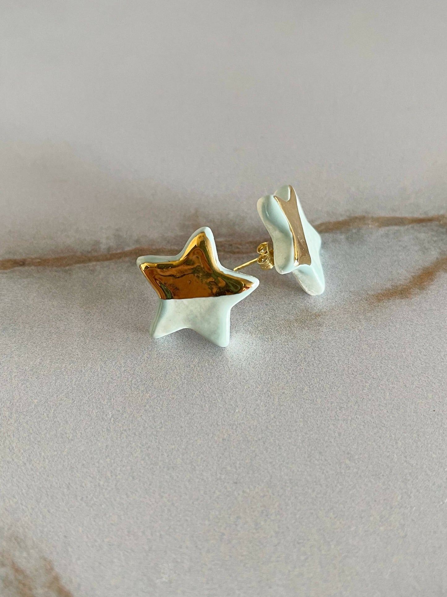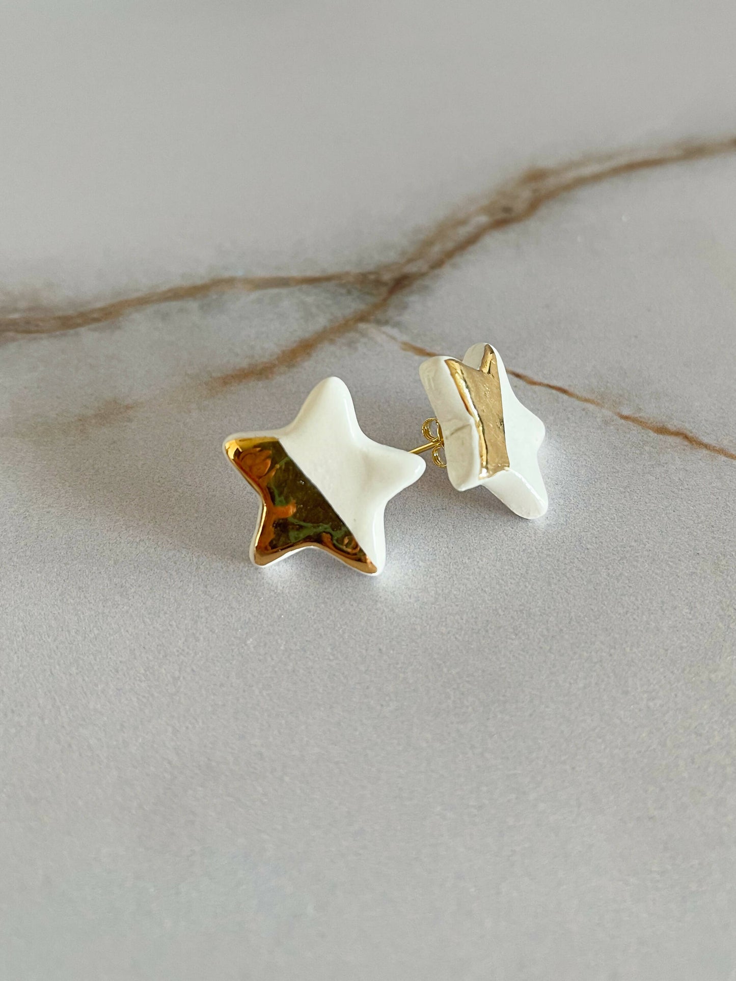 Made in Chile, with the modeling technique, these star earrings are ideal for any occasion. They are made with low-temperature ceramic and decorated with 24 kt gold luster.