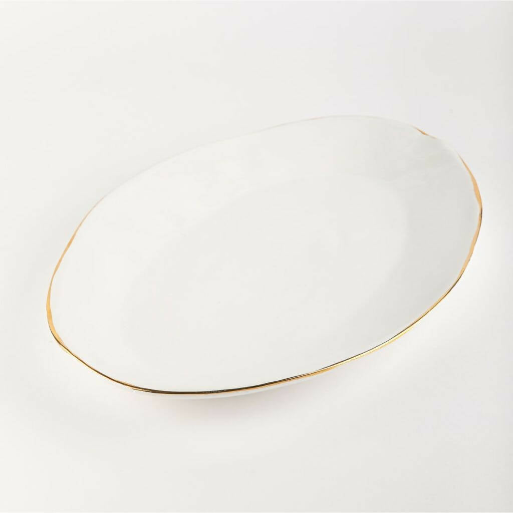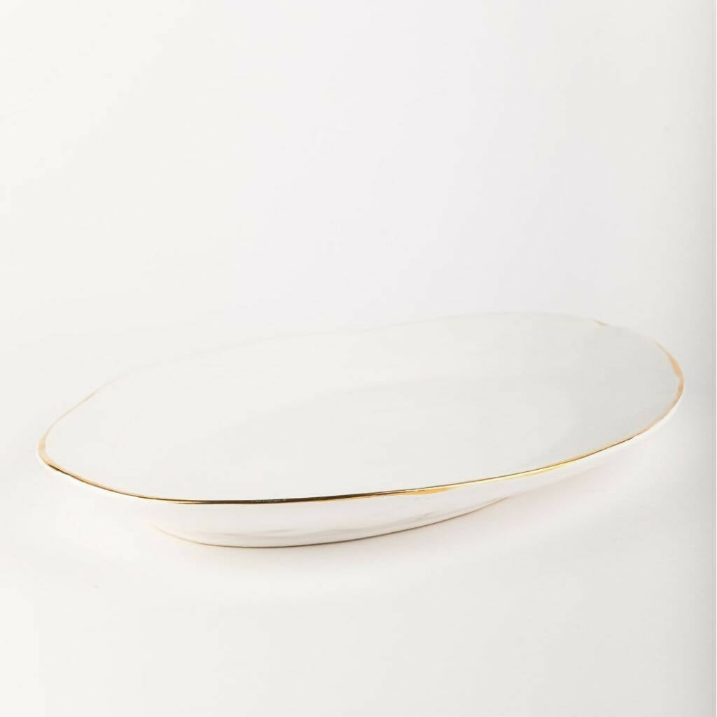 This collection gives an elegant touch to your table.The artisian ceramic shapes are glazed a soft white with a subtle handcrafted gold rims