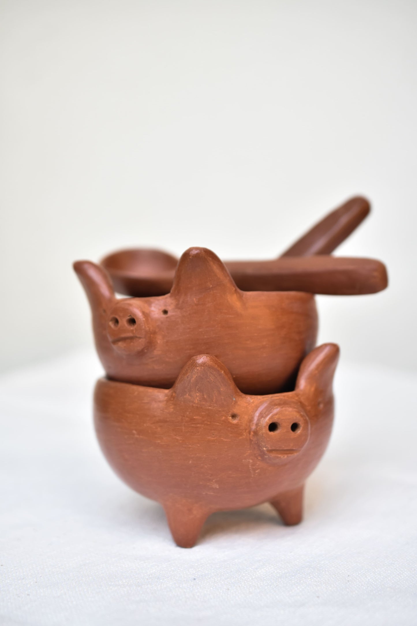 This charming cochinito-shaped salsa bowl is handcrafted from traditional red clay by artisans in Oaxaca, Mexico. Its playful pig design adds a touch of warmth and personality to any table setting, perfect for serving salsas, dips, or small snacks. Each piece is uniquely made by hand, showcasing the rustic beauty and cultural richness of Oaxacan pottery.