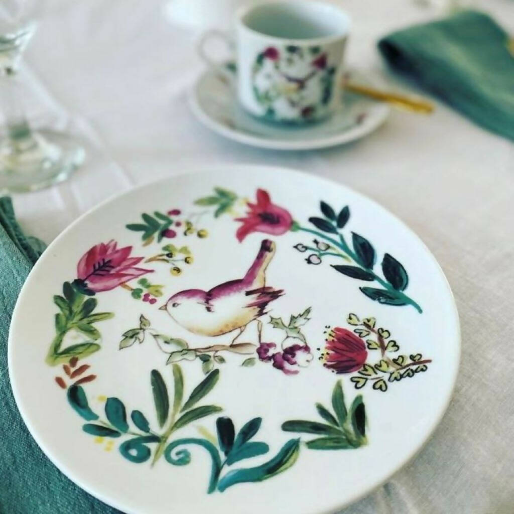 The salad plate´s soft organic shape brings a warm and welcoming feel to everyday and spcecial -occasion.Pía Sanoner has been drawn to the beauty of natural world for a long time,designs birds that grace her ceramics