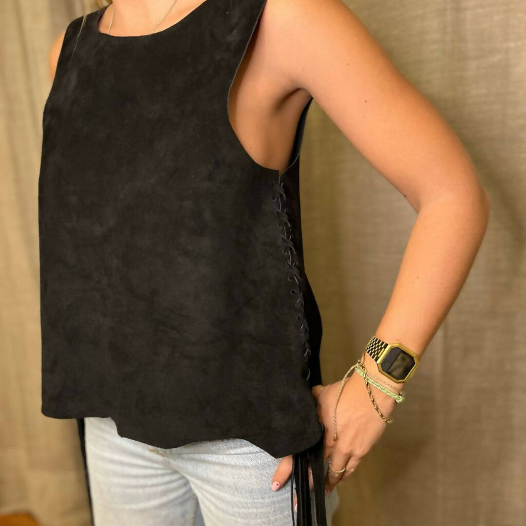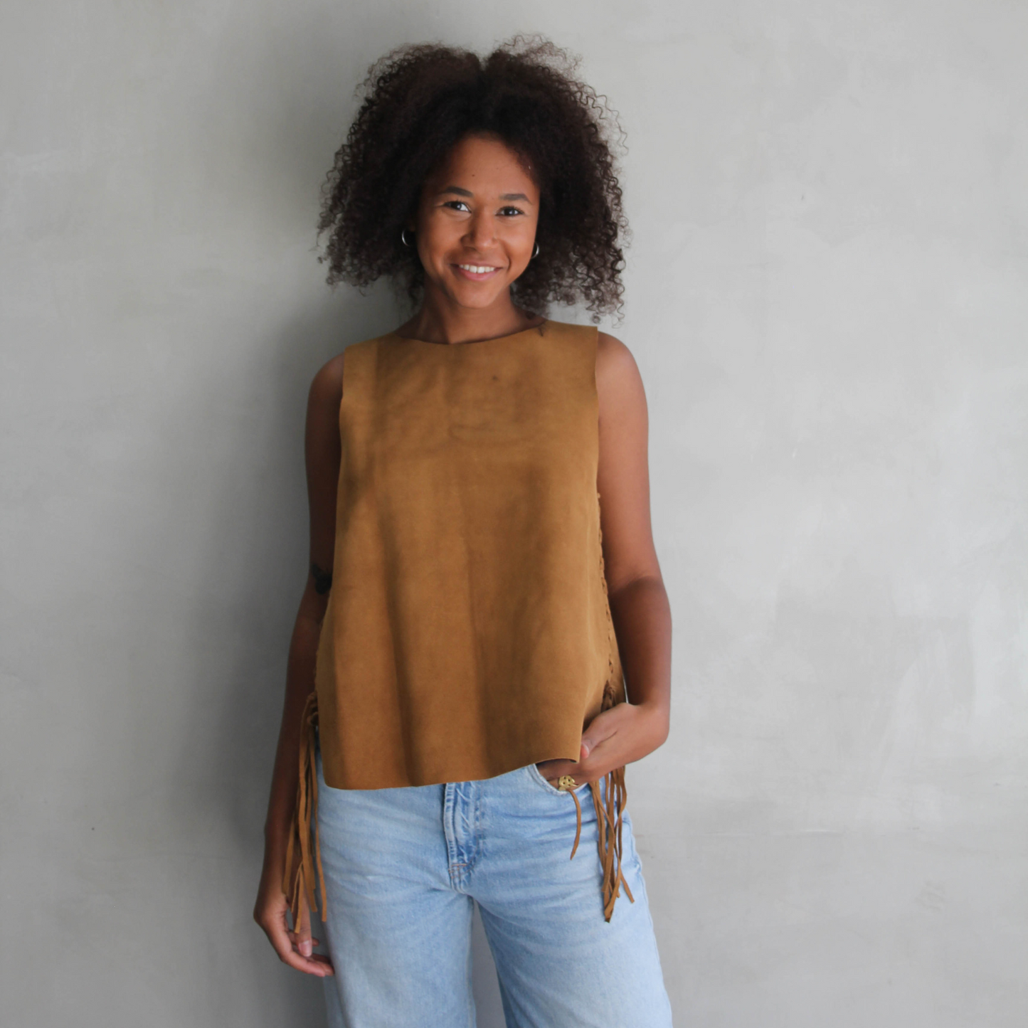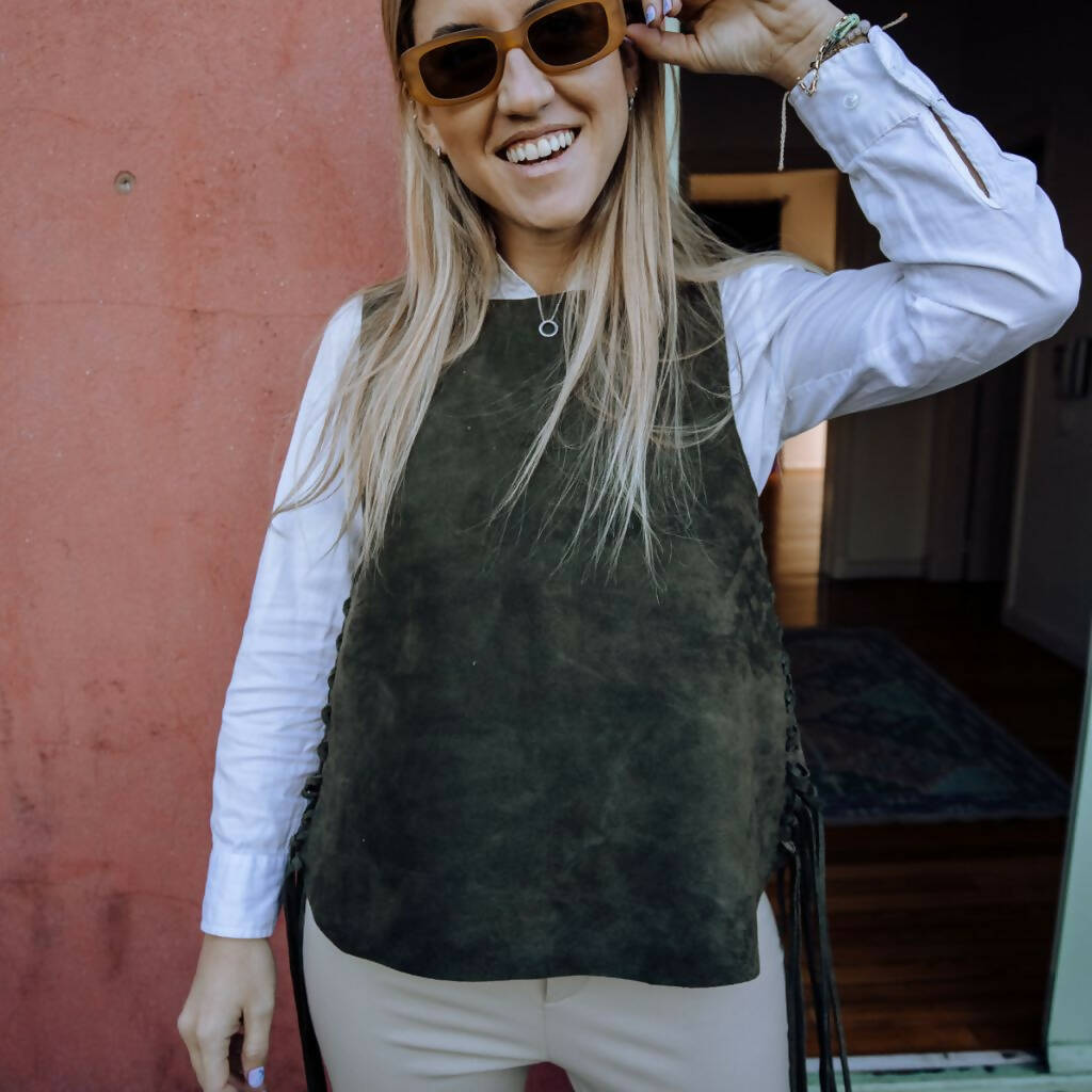 100% handmade Argentine suede leather top. A versatile top which can be used anytime, seasonless. Wear it alone or with a shirt below. It has fringes on the sides. A garment that will last you forever!Leather is an unique material, that's why each top can be subtly different from the other, and that's the beauty of this material.How to care for leather?Try not to get it wet (or with rainwater). If it gets wet, just wipe it with a dry cloth to absorb the excess and let it dry at room temperature (never in the sun or with a dryer).In the event of any grease/oil stain, also wipe it with a dry cloth to absorb (without rubbing).