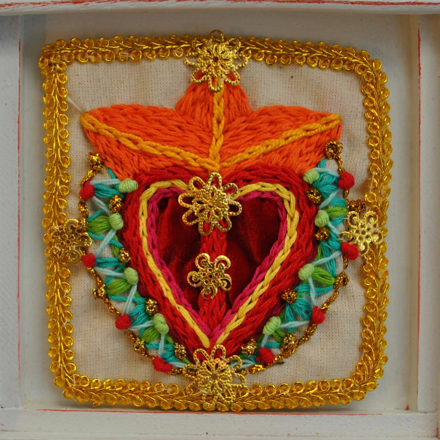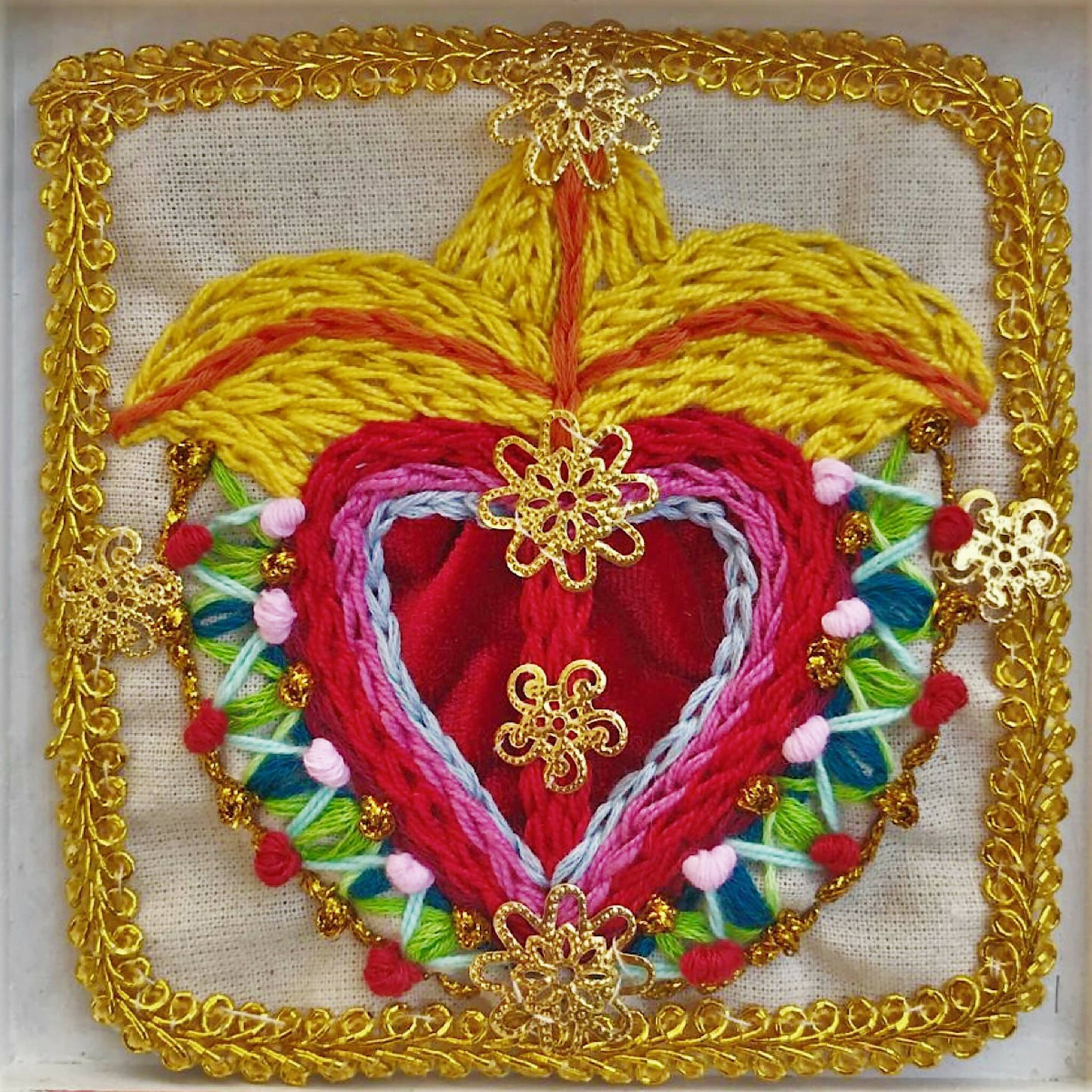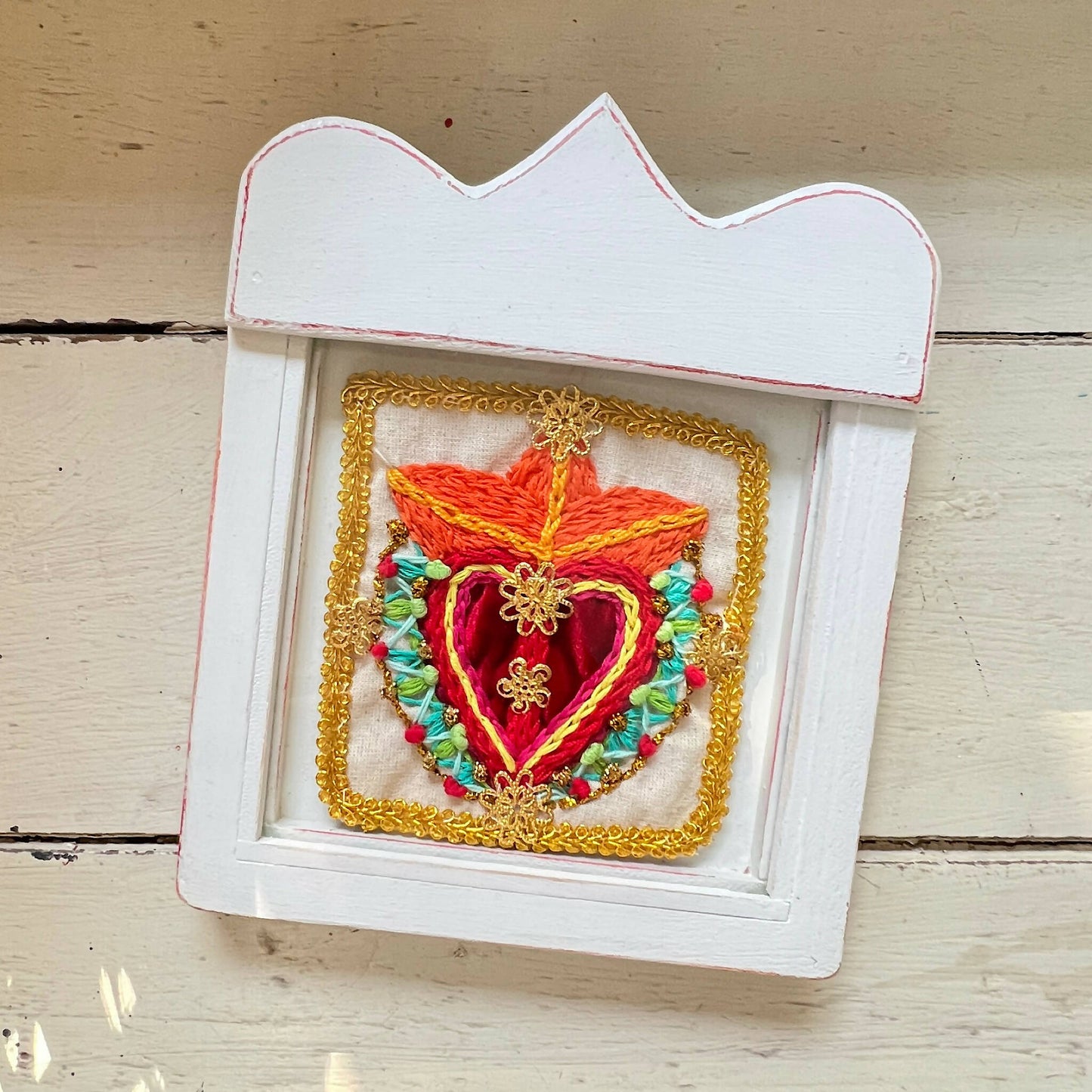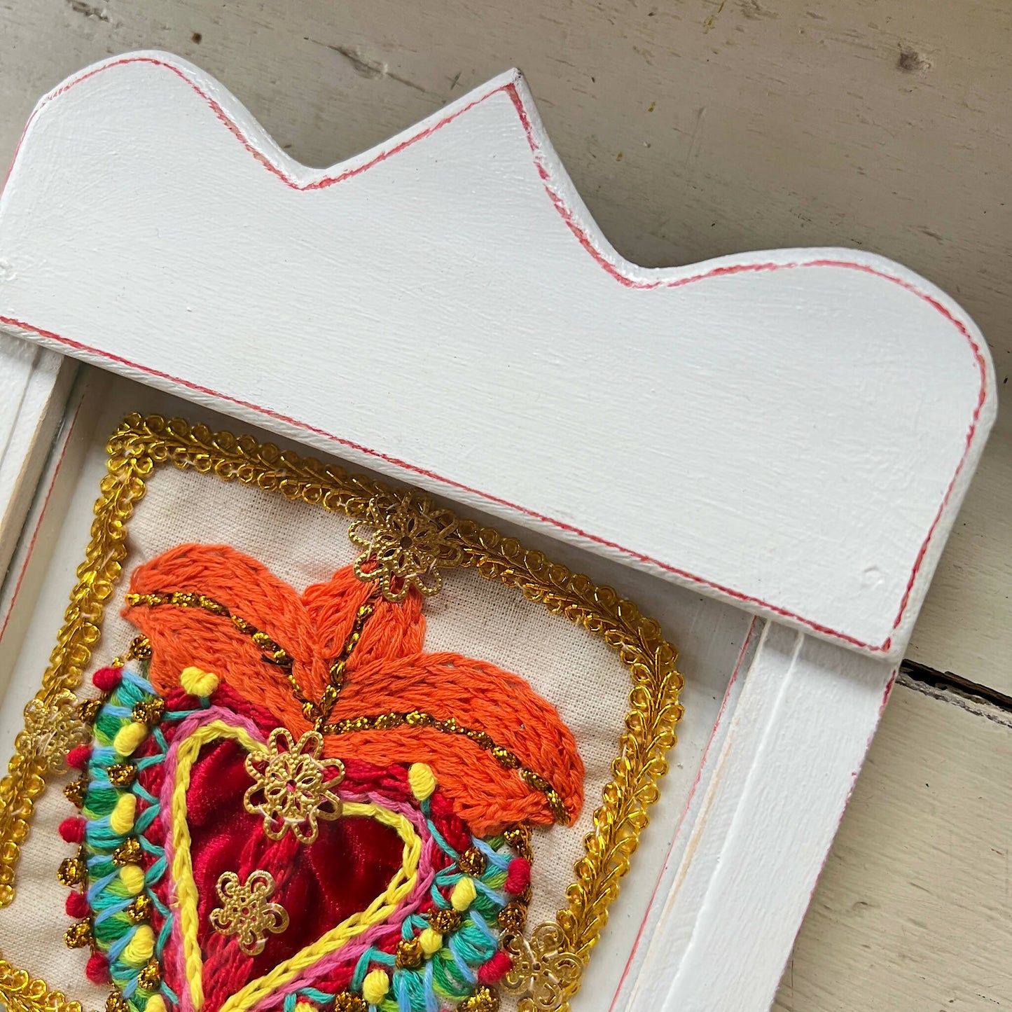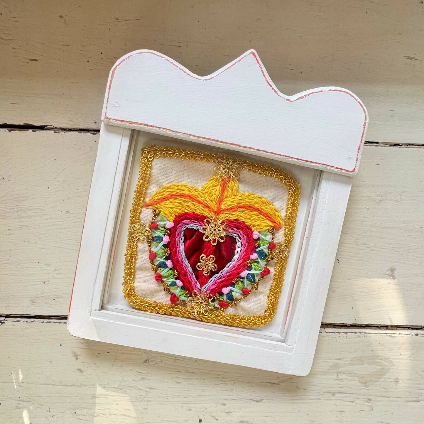 Manufactured completely by hand, from the carpentry of the altarpiece to the embroidery inside, it is for this reason that each piece is unique and never identical to another.In a slow production process and full of details, which is why its production is exclusively in very limited quantities. The Chilean artist and artisan Rocío Inostroza, creator of these altarpieces, rescues an ancient tradition full of beauty and meaning, where women embroidered a Heart of Jesus, as a protection amulet for their loved ones, a custom that belongs to the beliefs and popular arts of their country and their own family history.
